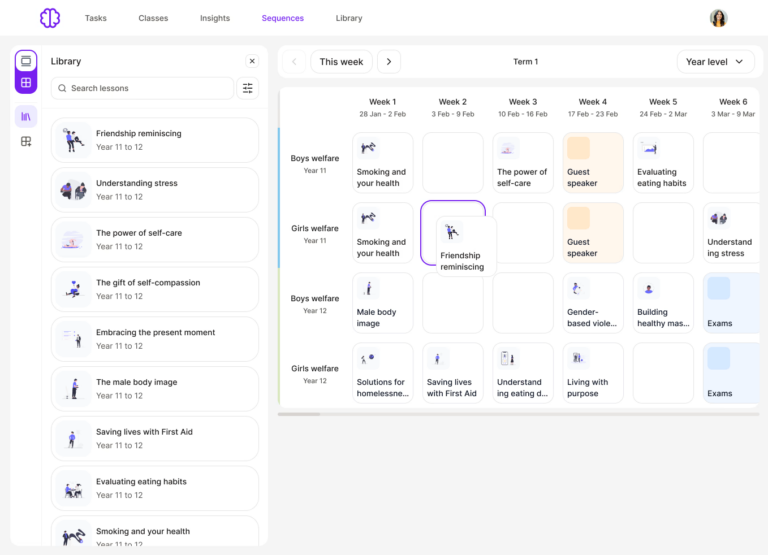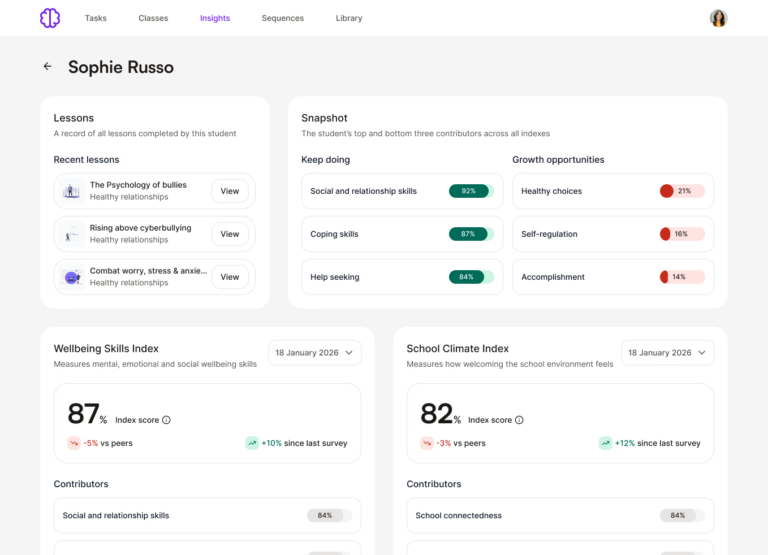 Designed by clinical psychologists and experienced educators, Wellio combines a comprehensive lesson library with integrated Insights tools in one platform. Schools create a tailored programme from a library of 650+ lessons spanning K–13, adapting content to reflect their ethos, faith context and community priorities.