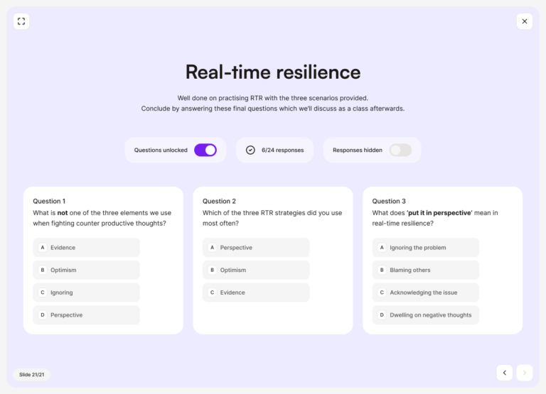 Teacher-led lessons use short videos, polls, activities and discussions. Anonymous responses support safer conversations, and device-free options make lessons easy anywhere.